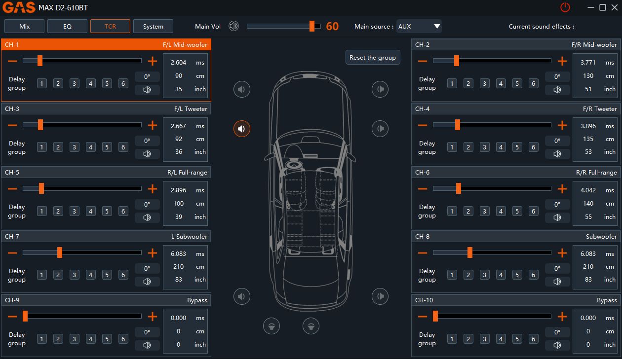 Alla högtalare sitter inte på samma avstånd från lyssnaren. Därför erbjuder D2-610BT tidskompensering med justering i centimetersteg. Du kan ställa varje kanal mellan 0 och 20 ms (0–692 cm), så att ljudet från alla högtalare når örat samtidigt. Resultatet är en ljudbild som sitter i mitten. Som känns rätt.