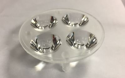 En plastbas med fyra klart 3D-linser på en vit bakgrund.