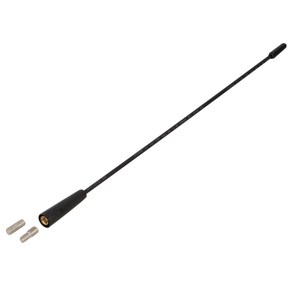 Antennens dimensioner är en längd på 34,5 cm med en 6 mm gänga och en adapter för M6>M6 samt M6>M5 extern.