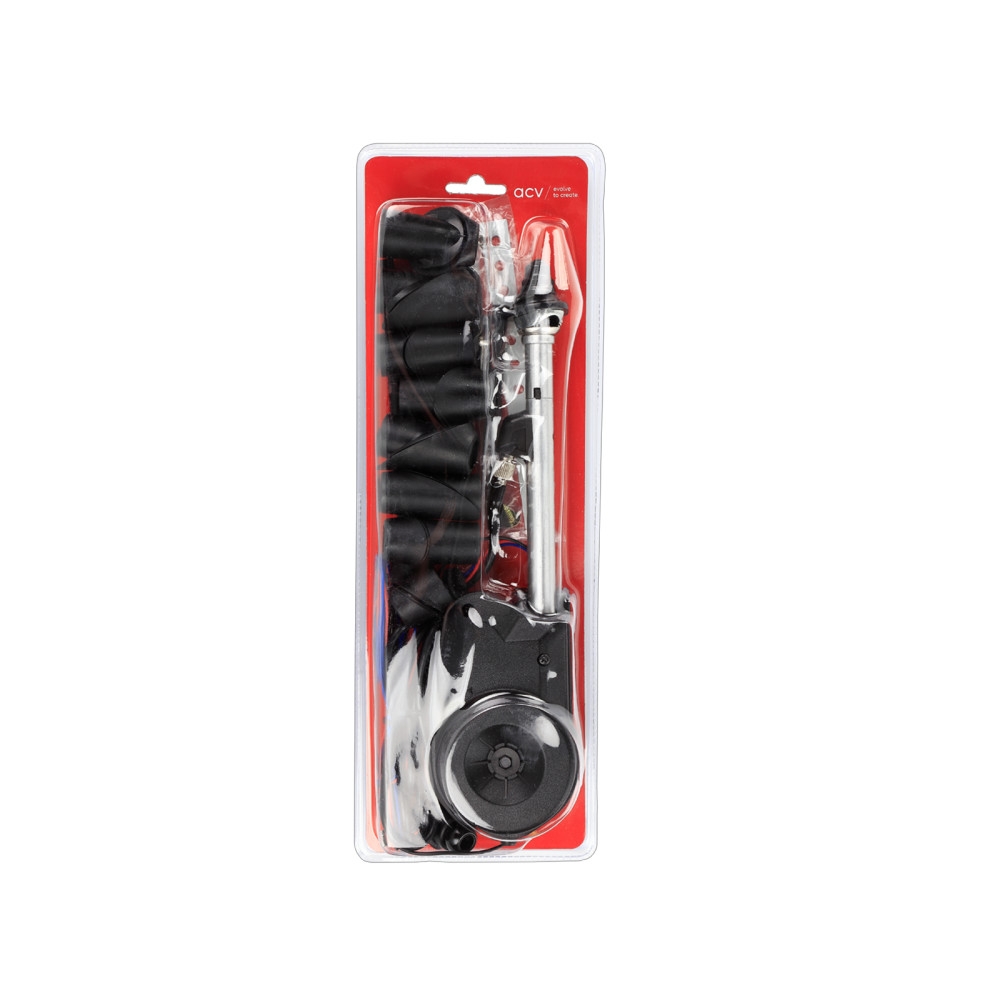 ACV 151000-38-2 är en teleskopantenn för AM/FM med automatisk funktion, designad för montering på fender eller pelare och i en svart finish.