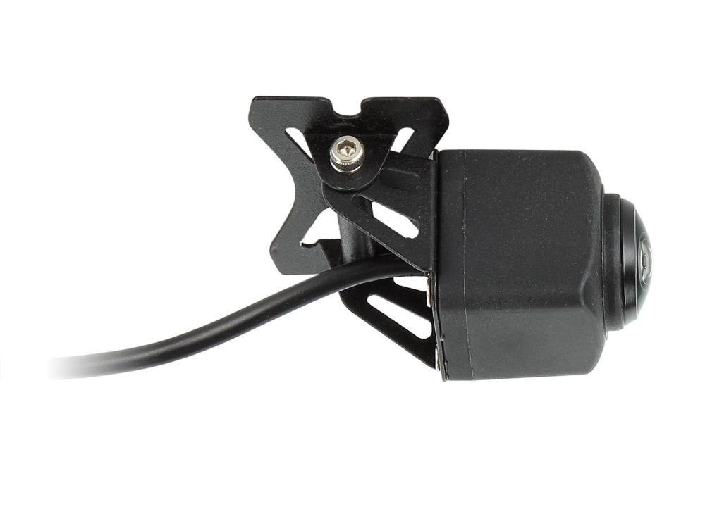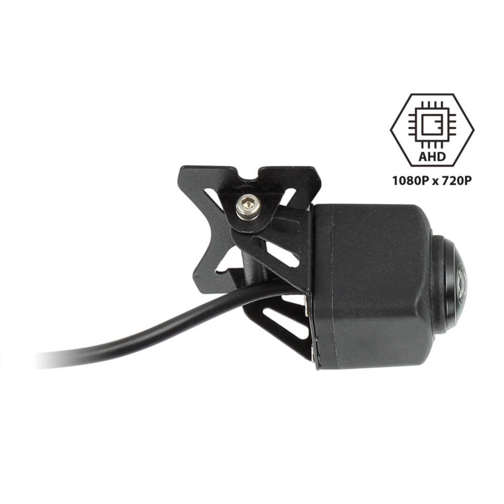Produkten är designad i plast med ett justerbart metallfäste och har en svart färg. Kameran har en bildsensor på 1/2,8 AHD och ger en upplösning på 1080 x 720 pixlar. Den har en lins med ett diagonalt synfält på 230°, vilket ger ett horisontellt synfält på 180° och vertikalt synfält på 140° plus 5°. Kameran är lämplig för kontinuerlig drift och bör kontrolleras för rätt synvinkel och justering på installationsplatsen med en testmonitor innan installation. Kamerans anslutningar inkluderar en röd kabel för +12V, en svart kabel för jordanslutning, och en gul RCA-kabel för video. Det finns även en grön jumper för att aktivera/deaktivera guidelinjer och en vit jumper för att aktivera/deaktivera spegelfunktionen. Kameran levereras med en 1 meter lång pigtail med 4-polig ACV-systemkontakt och inkluderar installationsaccessoarer som en framåtvänd kamerabrytare och olika kamerakabelförlängningar.