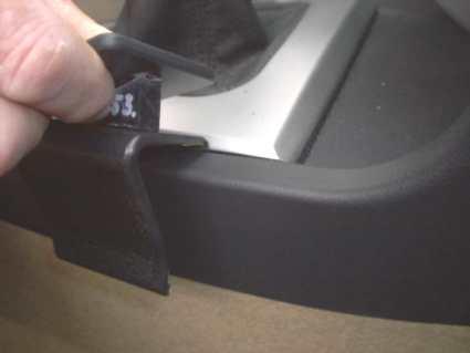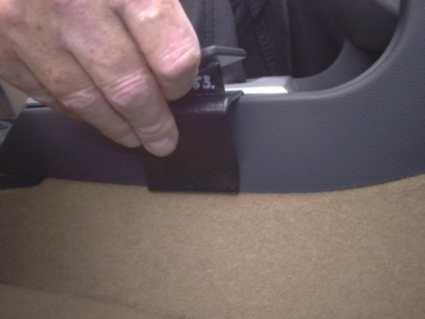 En hand håller i en del av bilen, troligtvis en konsolkomponent.
