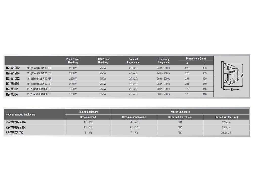 De nya R-Series subwoofers finns i storlekarna 12”, 10” och 8” och erbjuds med dubbel 2Ω och dubbel 4Ω impedans.