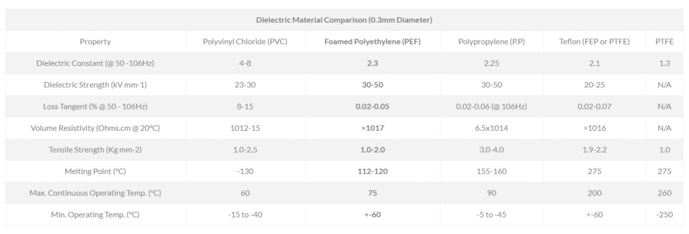 Ännu bättre är PTFE, som är ett unikt dielektriskt material med låg densitet och som är fasstabilt vid rumstemperatur. Som material är det mer kostsamt. Den absolut bästa isoleringen är luft, men det är naturligt inte praktiskt i en kabeldesign. Ledare som ligger fritt i ett rör med luft gör att kabelns elektriska egenskaper blir olika beroende på hur de är positionerade för tillfället och är därför inget alternativ för konsekvent och exakt prestanda. Med Atlas idé att använda mikroporös PTFE så får man ett minimum av kontaktyta av isoleringen mot ledarna och man kan samtidigt mer precist hålla dem på plats.
