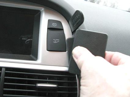 En hand håller en svart plastbit nära en bilkontrollpanel.