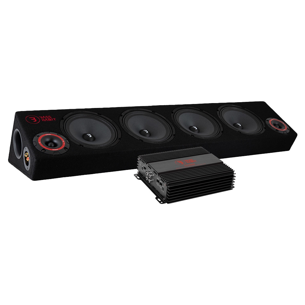 Bass Habit SPL64 med RA500W är ett paket med en portad raggarplanka som har fyra 6.5" midbasar och två SPL-diskanter från Play-serien, tillsammans med ett prisvärt 2-kanals slutsteg som ger bra effekt för framsystem och mindre baslådor. Perfekt för dig som vill ha högt och klart ljud utan att det kostar för mycket.