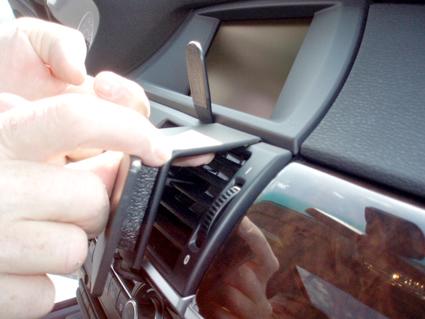 En hand justerar aircondition-ventilen i en BMW X5/X6-interiör.