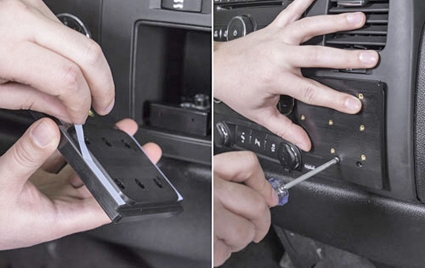 2. Placera de medsända bultarna och brickorna i hålen i monteringsbasen. Placera monteringsbasen i förvaringsfacket så hålen överensstämmer och bultarna kan gå igenom. Placera bottenplattan över bultarna underifrån. Skruva fast de medsända muttrarna så monteringsbasen och bottenplattan låses ihop. Pressa försiktigt tillbaka instrumentbrädans panel.