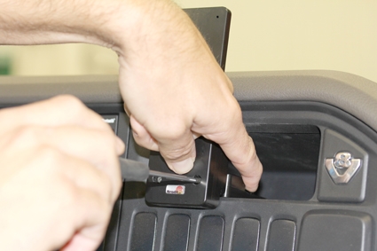 1. Avlägsna gummimattan i förvaringsfacket. Använd den medsända våtservetten till att rengöra området där ProClip-fästet ska monteras. Placera de utskjutande delarna på Del 1 i de tre vänstra hålen i facket. Pressa nedåt så att de utskjutande delarna går helt i hålen.