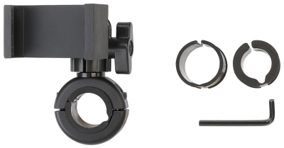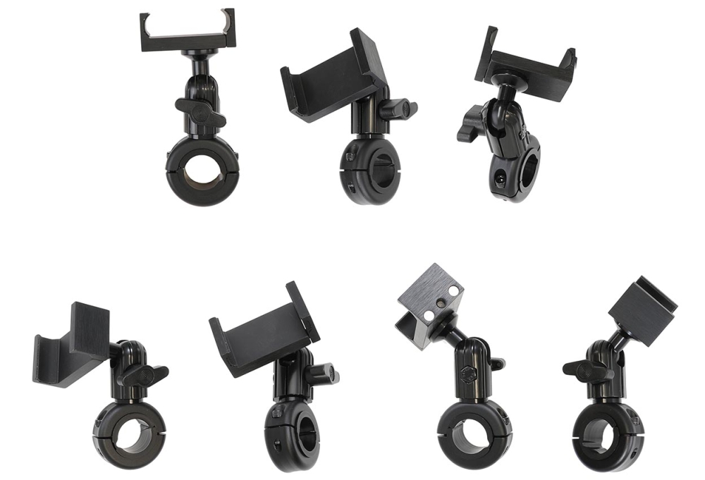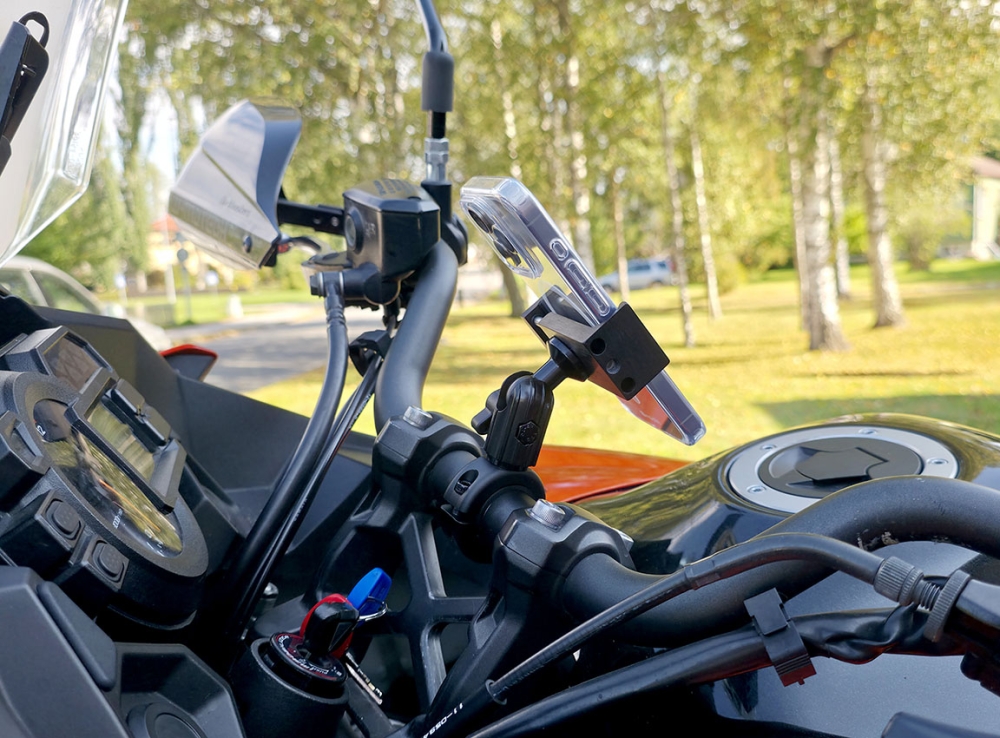 Stabilt motorcykelfäste med mobilhållare för montering på styret. Fästet är ledat på två ställen så du kan enkelt justera vinkeln och låsa i önskat läge med vingmutter. Piedestaldelen på fästet är 40 mm lång och kan vridas 360° . Totallängd 107 mm. Passar motorcykelstyren med diameter 20–32 mm. Kan även användas på cykel, elcykel och andra runda rör med diameter 20-32 mm.