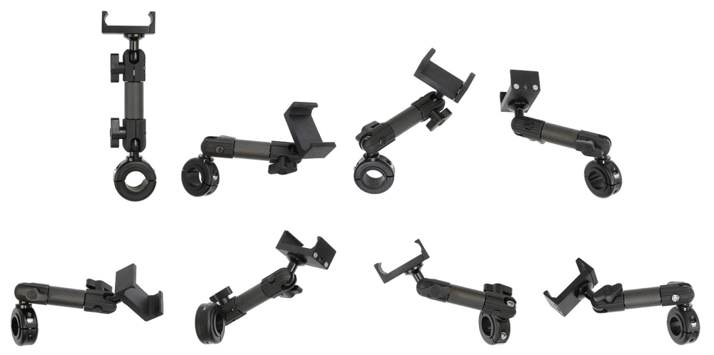 Stabilt motorcykelfäste med mobilhållare för montering på styret. Fästet är ledat på två ställen så du kan enkelt justera vinkeln och låsa i önskat läge med vingmutter. Piedestaldelen på fästet är 123 mm lång och kan vridas 360° . Totallängd 156 mm. Passar motorcykelstyren med diameter 20–32 mm. Kan även användas på cykel, elcykel och andra runda rör med diameter 20-32 mm.
