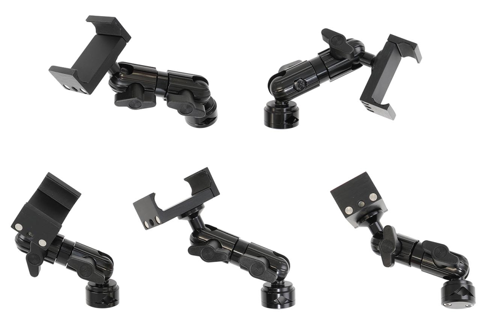 Stabilt motorcykelfäste med mobilhållare för montering på sidospegelns stag. Fästet är ledat på två ställen så du kan enkelt justera vinkeln och låsa i önskat läge med vingmutter. Piedestaldelen på fästet är 90 mm lång och kan vridas 360° . Totallängd 101 mm. Passar motorcykelstyren med spegelstag med diameter 8-14 mm. Kan även användas på andra runda rör med diameter 8-14 mm.