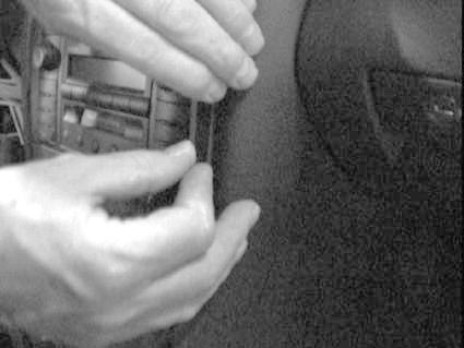 Pressa in den medsända springöppnaren i springan mellan kontrollpanelen och den omgivande ramen. Avlägsna tejpen på ProClip-hållarens monteringsdel.