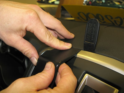 2. Pressa in springöppnaren mellan ramen som omger kontrollpanelen och instrumentbrädan. Haka fast fästets vinklade överdel i springan intill springöppnaren.