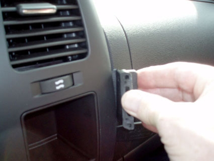1. Pressa in den medsända springöppnaren i springan i instrumentbrädan för att vidga springan. Avlägsna skyddsplasten på den dubbelhäftande tejpen på Del 1.