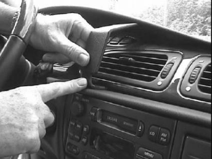 3. Pressa in hållarens överdel i springan vid 2 mellan panelen som omger luftgallrena och den utstickande instrumentbrädan.