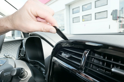 1. Använd den medsända våtservetten till att rengöra området där ProClip-fästet ska monteras. Pressa in den medsända springöppnaren mellan ramen som omger luftgallret och instrumentbrädan, för att vidga springan. Avlägsna skyddsplatsen på den dubbelhäftande tejpen på ProClip-fästet.