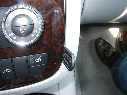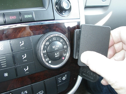 1. Pressa in den medsända springöppnaren mellan kontrollpanelen och den omgivande ramen för att vidga springan. Avlägsna skyddsplasten på den dubbelhäftande tejpen på ProClip-fästet.