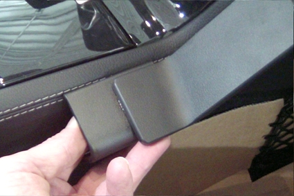 1. Använd den medsända våtservetten till att rengöra området där ProClip-fästet ska monteras. Avlägsna skyddsplasten på den dubbelhäftande tejpen på ProClip-fästet. Pressa in/Haka fast fästets vinklade nederdel under konsolkanten.