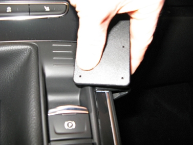 3. Pressa nedåt på fästets högerdel så att den vinklade kanten hakar fast ordentligt under mittkonsolen.
