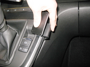 2. Pressa nedåt på fästets högerdel så att den vinklade kanten hakar fast under mittkonsolen.