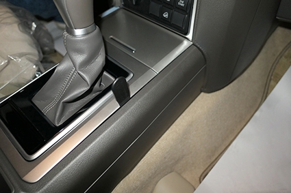 1. Presssa in den medsända springöppnaren mellan mittkonsolen och panelen som omger växelspaken, för att vidga springan. Använd den medsända våtservetten till att rengöra området där fästet ska monteras. Avlägsna skyddsplasten på den dubbelhäftande tejpen på fästet.