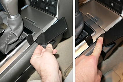 2. Pressa in fästets vinklade nederdel i springan i mittkonsolens sidovägg.