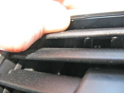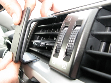 3. Pressa fästets nederdel uppåt/framåt och haka fast den vinklade kanten om ramen som omger luftgallret.