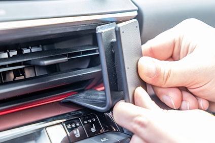 3. Pressa övre delen av ramen som omger luftgallret försiktigt uppåt. Pressa fästets överdel framåt så att kanten går i springan under ramen. Justera fästet i sidled så den övre kanten sitter ordentligt på plats, placerad mellan klackarna inuti springan.