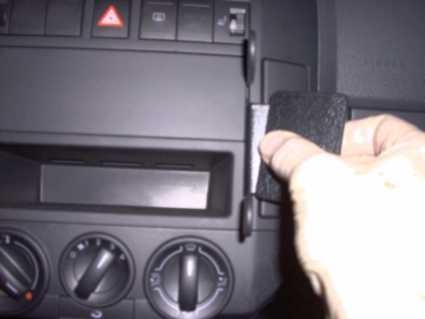 1. Pressa in de medsända springöppnarna i springan mellan stereon/myntfacket och den omgivande ramen för att vidga springan. Avlägsna skyddsplasten på de dubbelhäftande tejpremsorna på ProClip-hållaren. Pressa in hållarens vänsterdel i springan mellan springöppnarna.