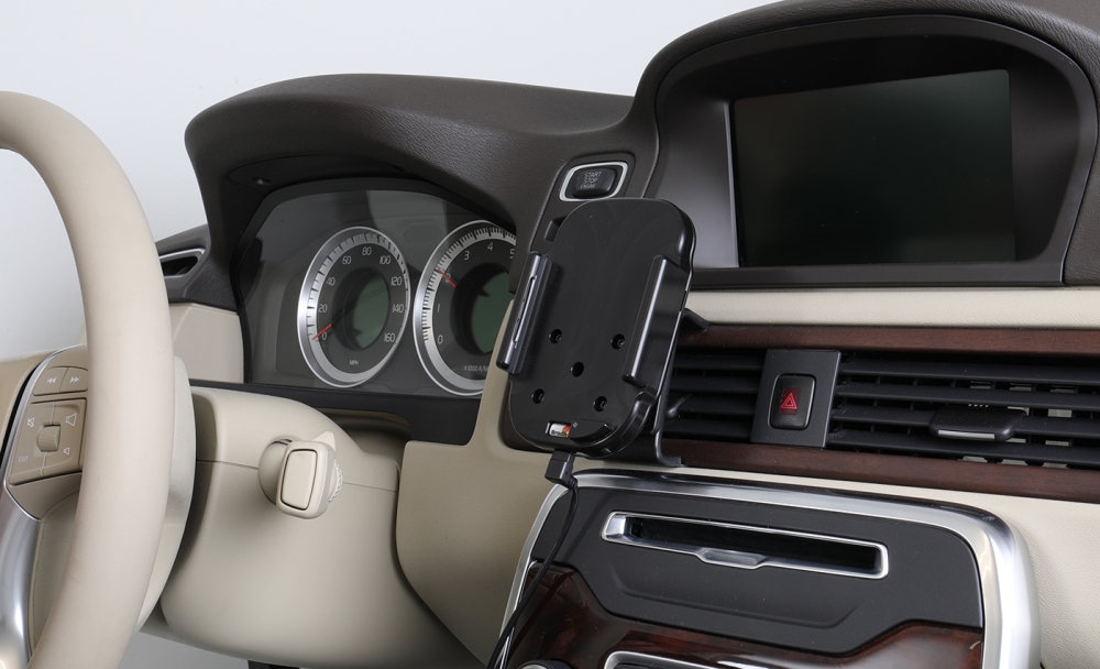 Du har full tillgång till kameran och alla knappar när enheten sitter i hållaren. Det är lätt att sätta enheten i hållaren så att den ansluter till laddningen, och att ta med den med ett enhandsgrepp när du lämnar bilen.