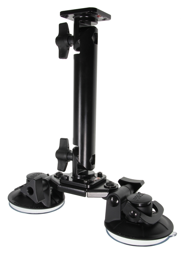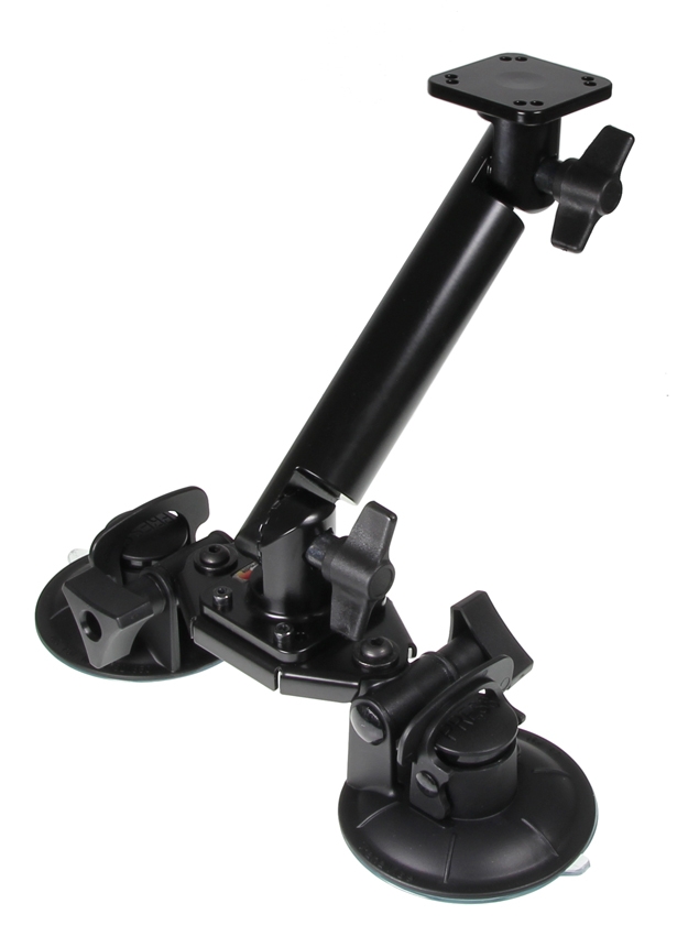 Den dubbla sugkoppen med PM-fäste ger en stark montering mot de flesta plana ytor. PM-fästet kan enkelt vinklas i steg om 24°, upp till max 192° (8 olika lägen), genom att lossa på vingmuttrarna. Monteringsplattan är 50x50 mm och har dubbla AMPS-hål.