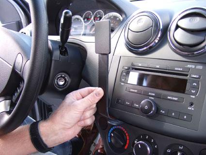 En hand placerar en svart enhet på instrumentpanelen i en Chevrolet Aveo.