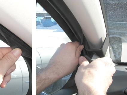 En hand trycker på ett gummiliknande remsa vid bilens fönsterkarm.