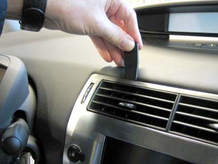 En hand lyfter en panel på instrumentbrädan av en Citroen C4.