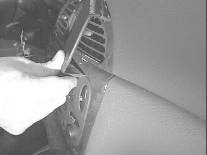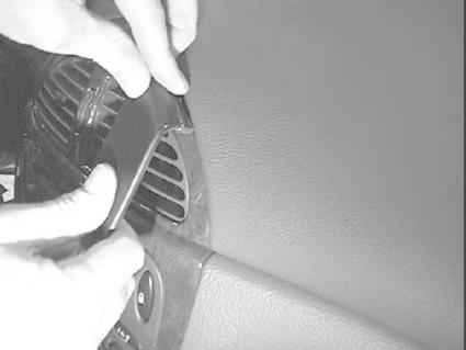 Bild visar en hand som arbetar med en del av bilens interiör, möjligtvis ventilation.