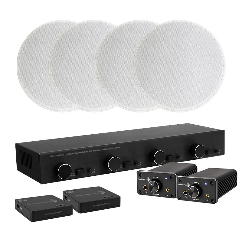 Spela trådlös musik i upp till 4 olika zoner samtidigt, utan at behöva ta upp en massa onödig utrymme! Med det här paketet får du 4st 6,5 tum infällnadshögtalare från System One, samt 2st av miniförstärkaren Dayton Audio DTA-120 och 2st WFA02 Wifi-adaptrar. De olika zonerna styrs av högtalarväxeln System One VSS4.