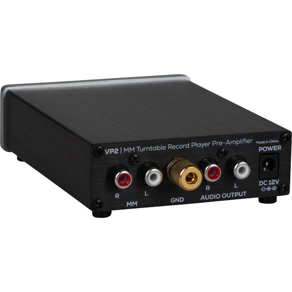 VP2 är avstämt för moving magnet-pickuper. Gainnivån på 40 dB ger ett balanserat lyft som behåller pickupens karaktär och förbättrar klarheten jämfört med enklare inbyggda phonosteg. Metallchassit minimerar störningar och den tilltagna jordskruven hjälper till att hålla systemet brumfritt även i enklare vinylriggar. Svart borstad aluminium med silverfront ger ett nedtonat uttryck som fungerar i de flesta anläggningar. Formatet är kompakt och lätt att placera i ett rack eller bakom förstärkaren.