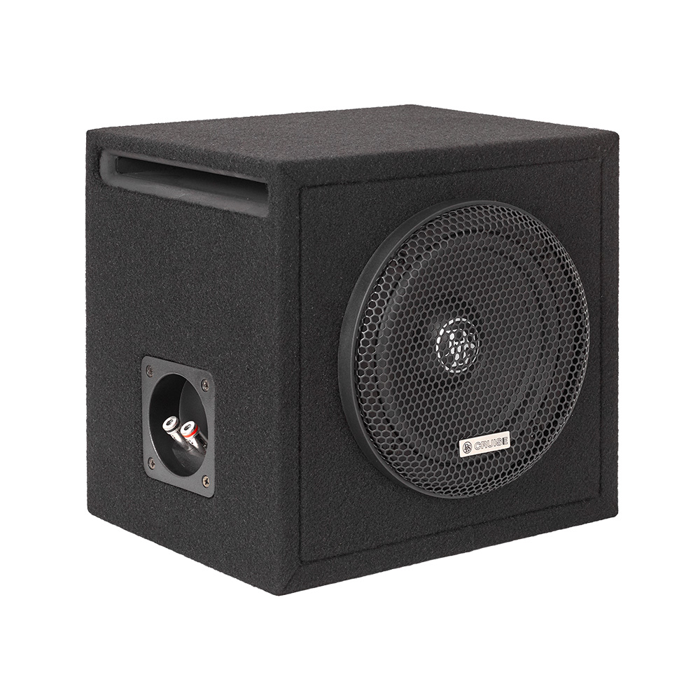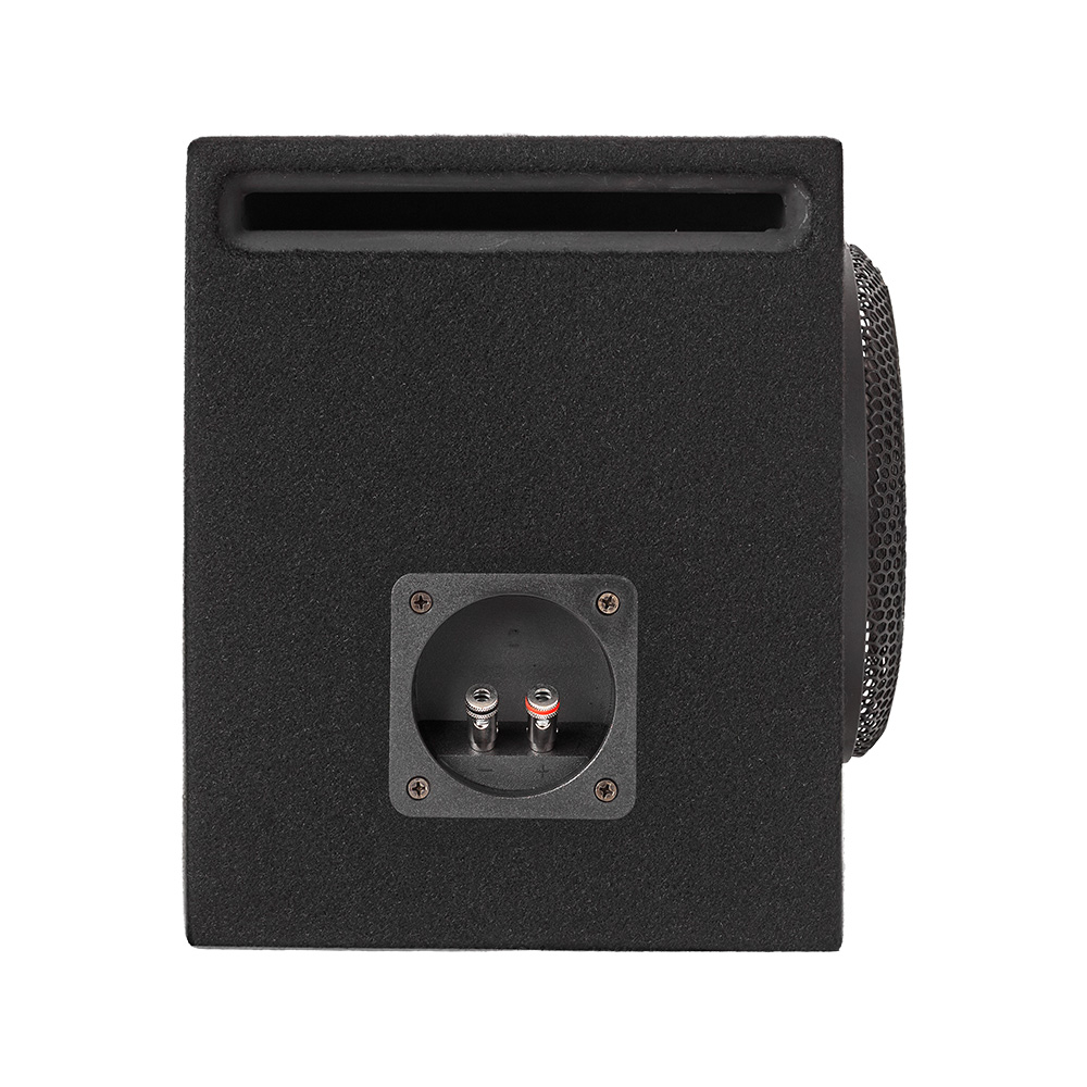 Lådan är formbyggd för att försvinna i bilen, med dold placering och en finish som känns genomarbetad. Stabilt kabinett, tydlig terminalplacering och skyddsgaller i metall gör installationen robust och redo för långvarig användning. Basreflexkonstruktionen med spaltport är vald för sin verkningsgrad i liten volym och sitt sätt att behålla kontrollen när du höjer volymen. I praktiken betyder det en botten som känns tät, följsam och lätt att integrera med frontsystemet.