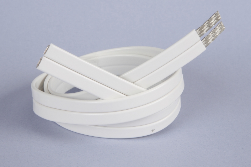 En superplatt kabel, endast 1,8 mm tjock och 11 mm bred, idealisk för väggmontering eller att lägga under en matta. På väggen används tex en dubbehäftande tejp som fäster på de flesta underlag.