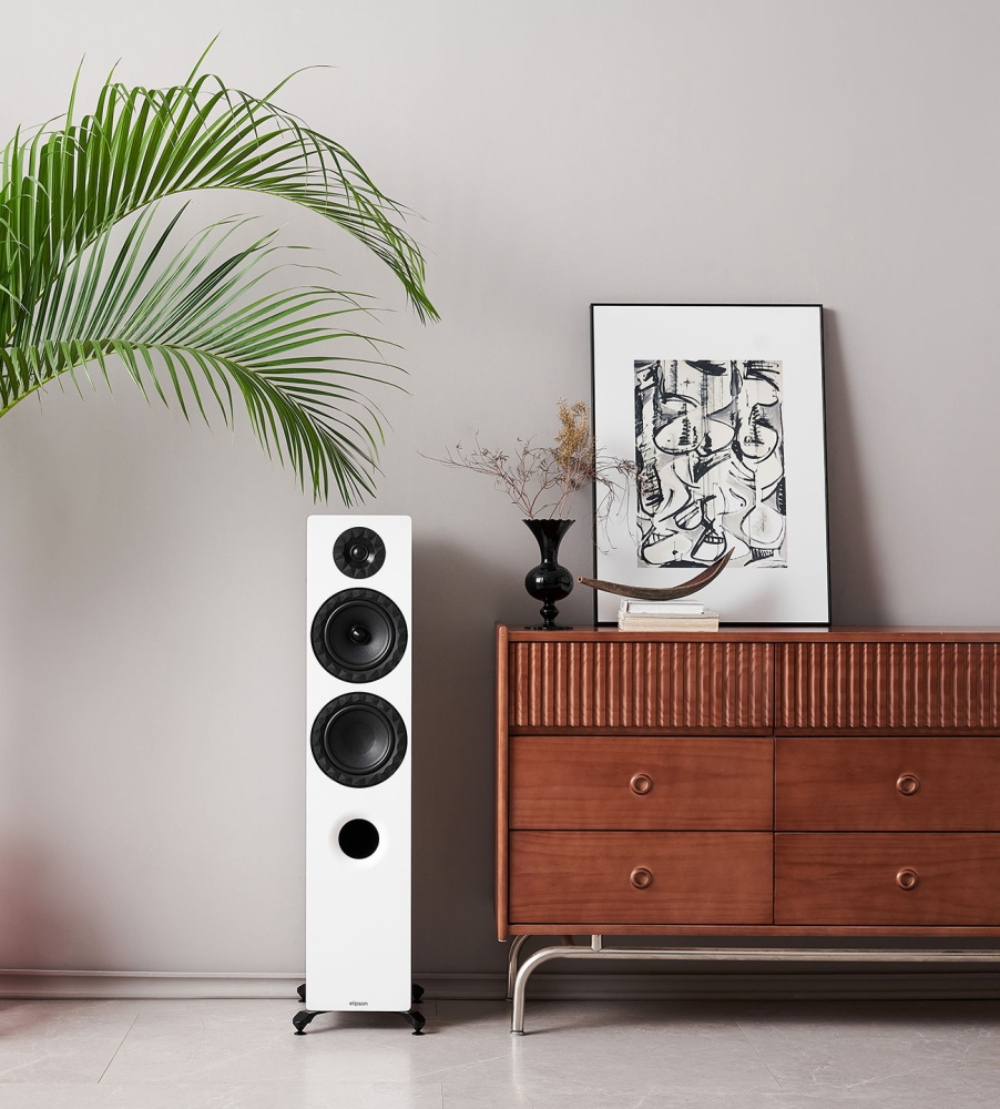 Högtalaren har ett gediget chassi med intern stagning som minskar oönskade vibrationer och ger stabilare ljudåtergivning. Den matta vita ytan är elegant och lätt att matcha med hemmiljöer. Premiumbindningarna säkerställer optimal kontakt med förstärkaren och långsiktig mekanisk stabilitet. Sammanfattningsvis en robust och stilren högtalare byggd för långvarig användning.