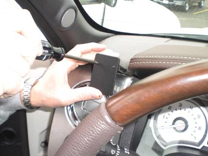 En person installerar en detalj på instrumentbrädan i en Ford F-Series 150.