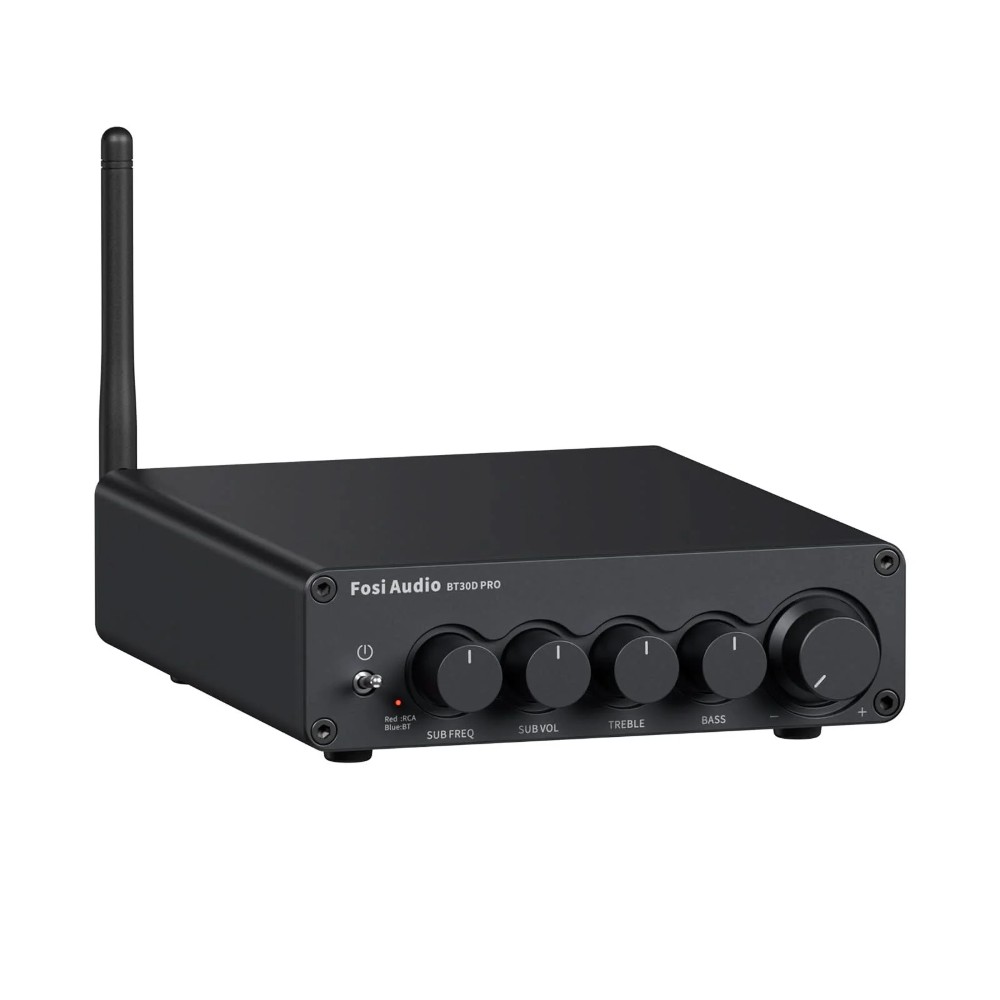 Fosi Audio BT30D Pro (32 V) är en kompakt 2.1-kanals förstärkare med Bluetooth och separat subwooferstyrning, byggd kring dubbla TPA3255-kretsar från Texas Instruments. Den driver två passiva högtalare och en passiv baslåda, samtidigt som den även kan mata aktiva enheter via pre-out. Med den medföljande 32 V, 5 A-nätdelen levererar den upp till 165 W x 2 till högtalarna och upp till 350 W till sub-kanalen, vilket gör den till en kraftfull men smidig lösning för skrivbord, vardagsrum eller mindre hemmabio.