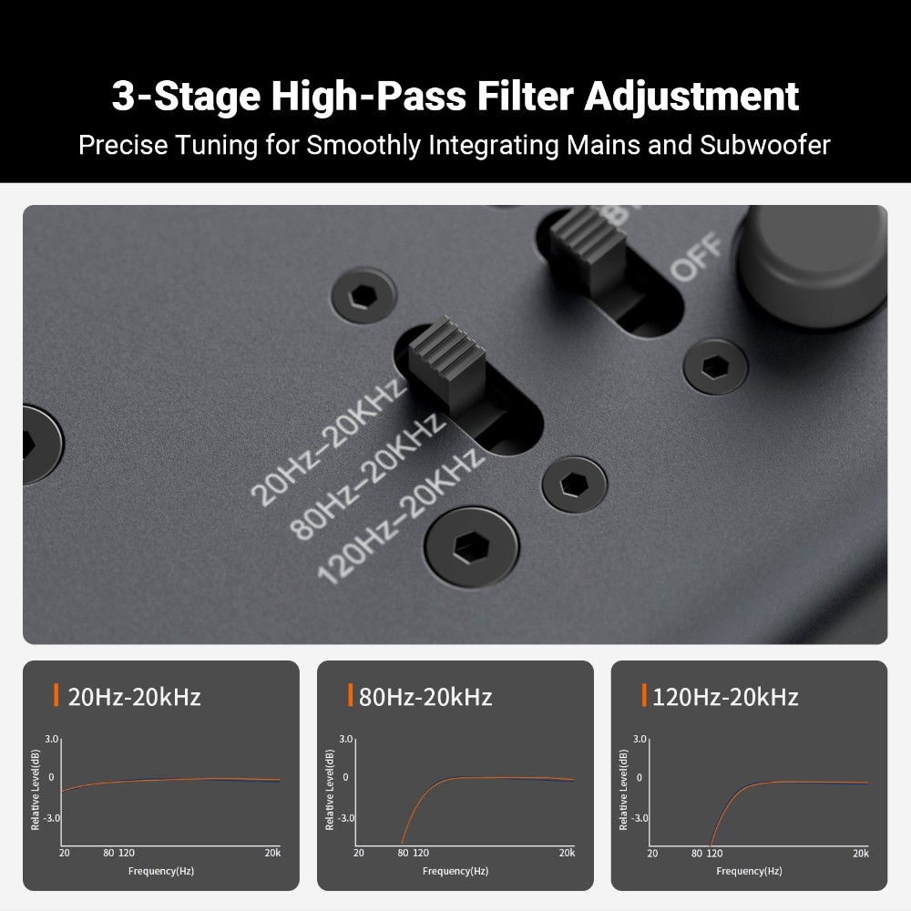 En av de mer genomtänkta funktionerna är det justerbara högpassfiltret i tre steg, 80 Hz eller 120 Hz, alternativt fullregister 20 Hz. När filtret aktiveras skickas mellanregister och diskant vidare till huvudhögtalarna via RCA eller XLR, medan låga frekvenser leds till SUB-utgången. Resultatet är en renare och mer kontrollerad återgivning, särskilt i system där en aktiv baslåda tar hand om det djupaste registret.