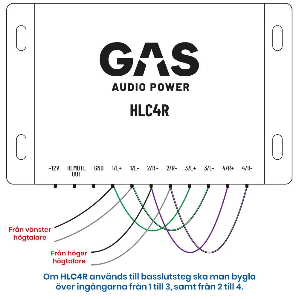 Om HLC4R används till basslutsteg så ska man bygla över ingångarna från 1 till 3, samt från 2 till 4.