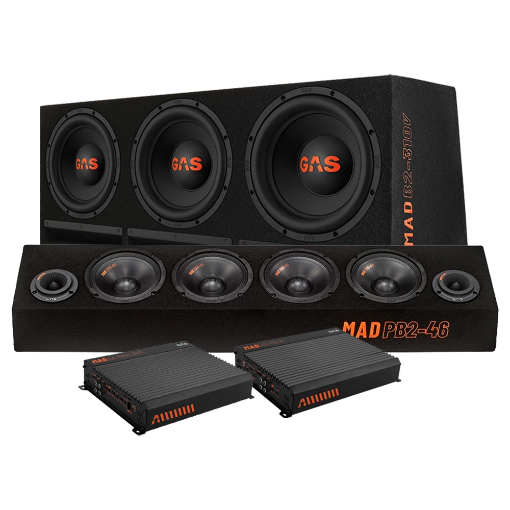 Det här paketet innehåller den robusta och kraftfulla baslådan GAS MAD B2-310V med tre 10" basar, det starka monoblocket MAD A2-1200.1DFL för maximal effekt, samt den färdigmonterade raggarplankan GAS MAD PB2-46 med midbasar och diskant. Slutsteget MAD A2-85.2 ger extra kraft till mellanregister och bas. Perfekt för dig som vill ha ett komplett och välspelande ljudsystem med hög effekt och tydligt ljud.