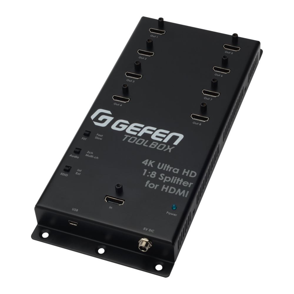 Gefen GTB-HD4K2K-148C-BLK är en professionell 1x8 HDMI-splitter som distribuerar en Ultra HD-signal till upp till åtta skärmar samtidigt utan kvalitetsförlust. Den stödjer upplösningar upp till 4K DCI 4096 x 2160 vid 24 och 30 Hz samt 4K Ultra HD 60 Hz 4:2:0, och är utvecklad för krävande installationer inom exempelvis digital signage och större videodistribution.