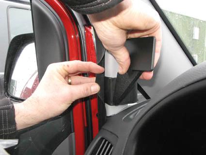 En hand installerar en del på förarsidan av en Hyundai H1.