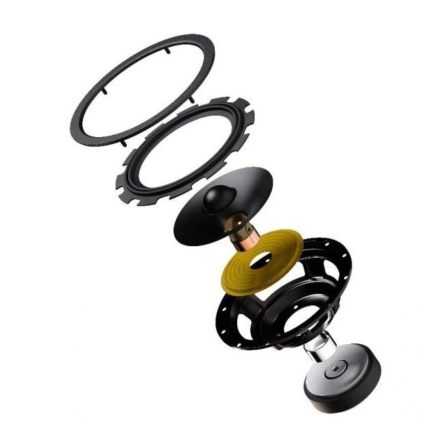 De dubbla mellanregister/baselementen använder polypropylenkoner som förstärkts med mica för att öka styvheten och förbättra återgivningen av små detaljer. De förbättrade magnetsystemen och de impedanslinjäriserande aluminiumringarna hjälper elementen att arbeta mer kontrollerat, med lägre distorsion och bättre stabilitet även när ljudnivån stiger. För en centerhögtalare är det särskilt viktigt, eftersom röster snabbt avslöjar om återgivningen blir grumlig eller pressad.