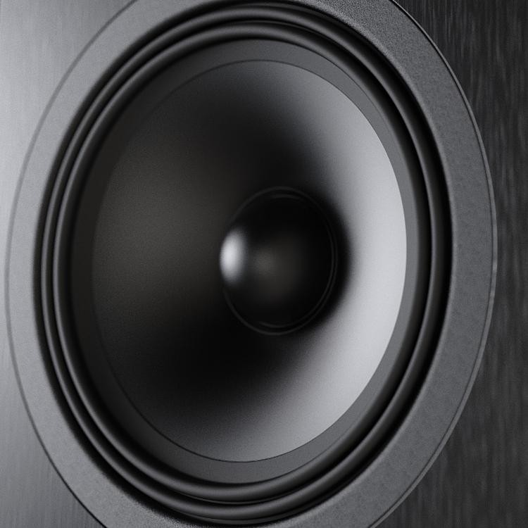 Kabinettet är byggt i MDF med intern dämpning av polyester och tvärgående förstärkningar som hjälper till att hålla resonanser och vibrationer under kontroll. Konstruktionen är optimerad för golvplacering, där den lätt lutande formen och höjden mot golvet samverkar med de dubbla basportarna i sockeln. Resultatet blir ett ljud med bra energi och spridning, utan att högtalaren känns överdrivet svårplacerad i vanliga vardagsrum.